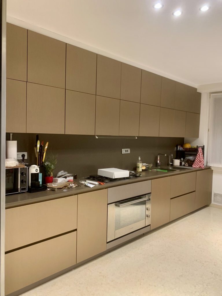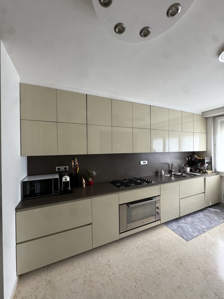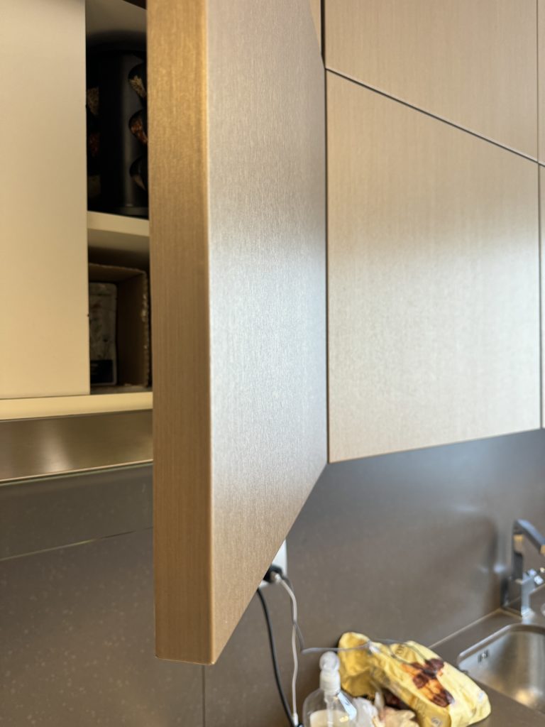 Due fantastiche finiture per questa cucina dal design unico ed elegante: laminato materico metallico oro e titanio spazzolati, meravigliosi!