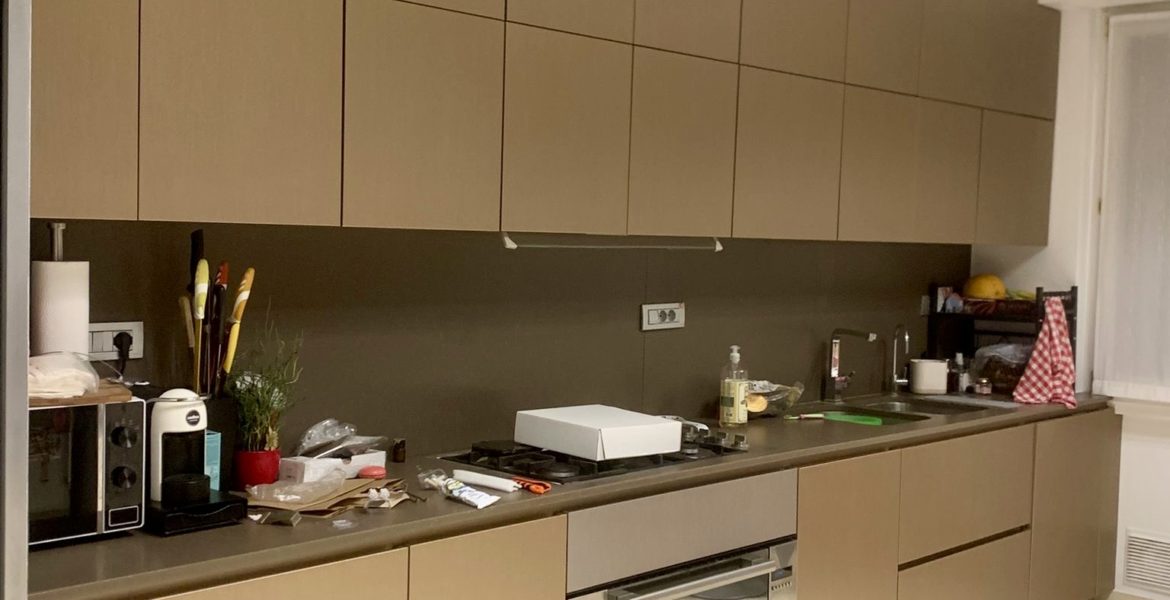 Due fantastiche finiture per questa cucina dal design unico ed elegante: laminato materico metallico oro e titanio spazzolati, meravigliosi!