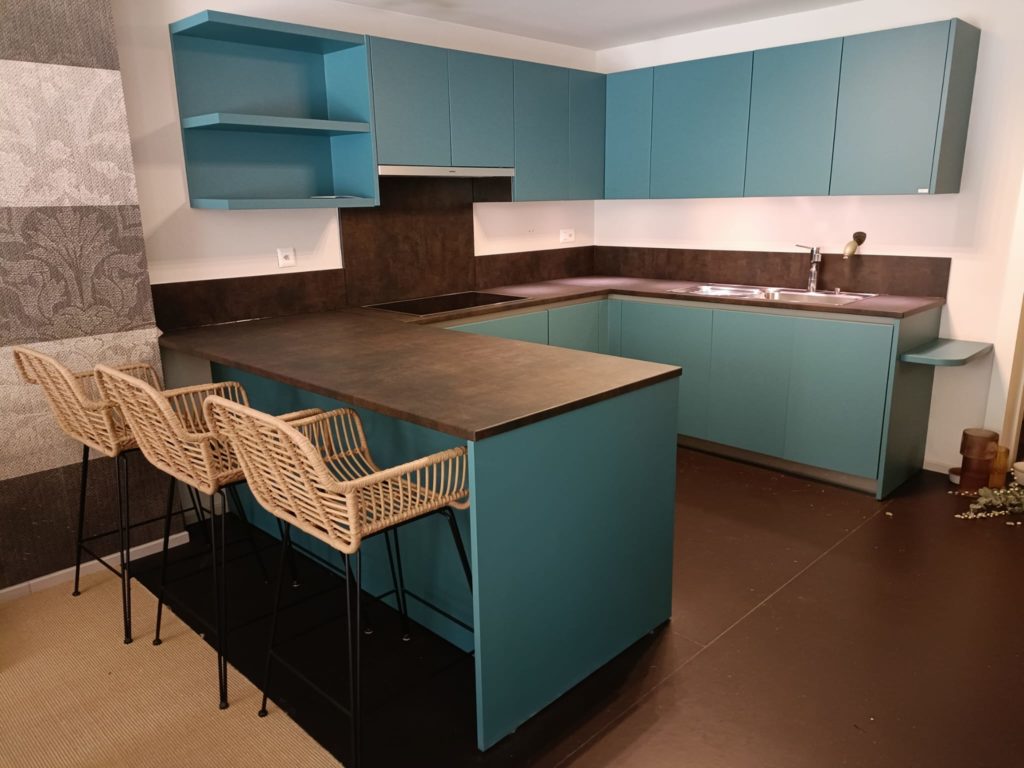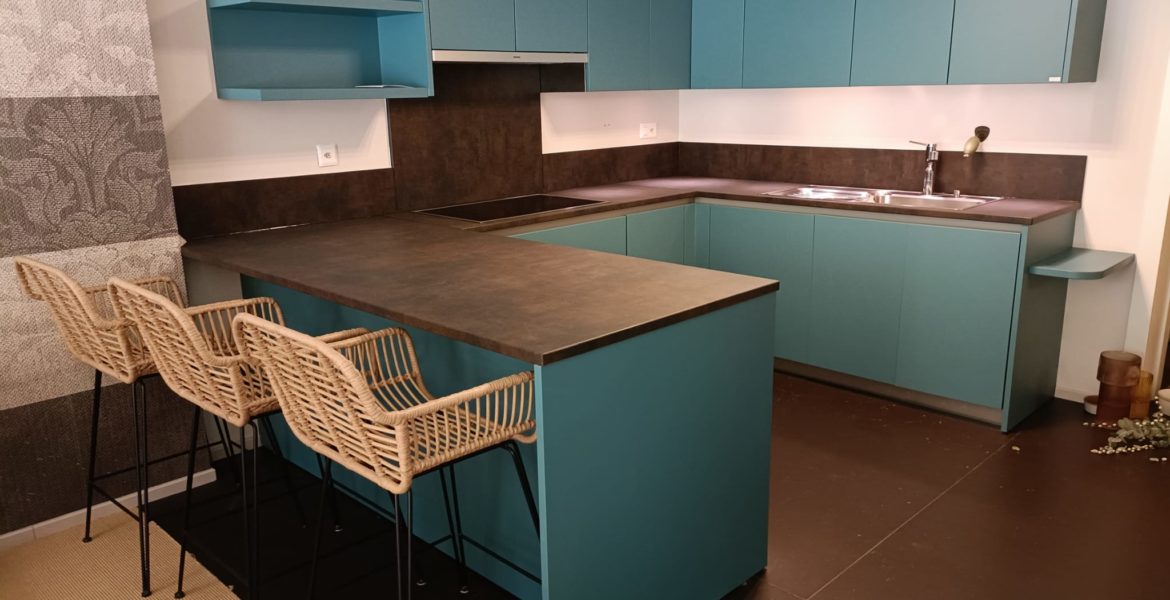A Febbraio la cucina più trendy è sicuramente questa, che grazie alla scelta del colore verde petrolio e del top in sintonia col pavimento, trasmette una sensazione “profonda” e di design!