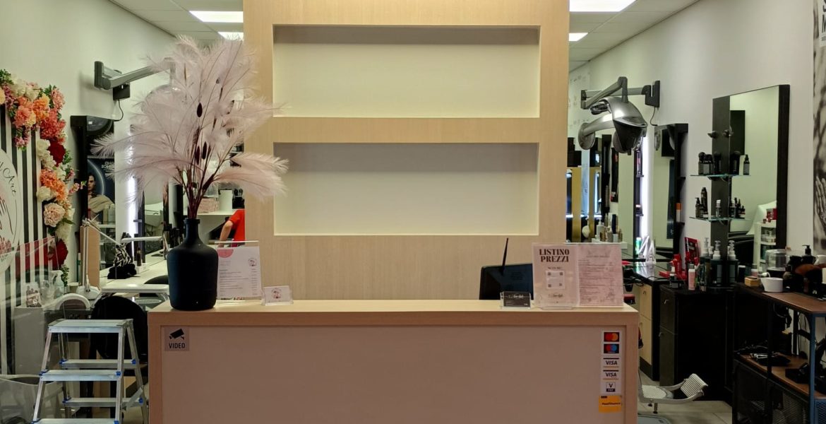Questo salone di parrucchieri è stato rinnovato completamente in soli 2 giorni, cambiando colore degli arredi con i nostri laminati adesivi.