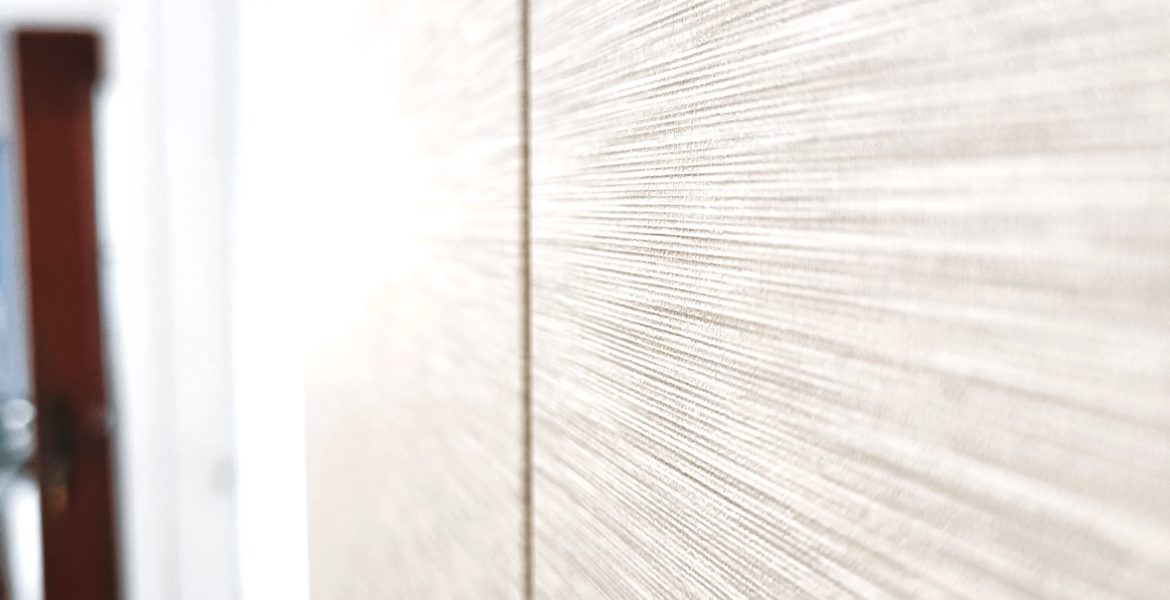 Lo abbiamo rivestito con una splendida finitura textile rigata orizzontale e cambiati i vecchi pomelli con un sistema push and pull a scomparsa.